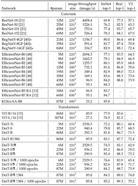 CNN 구조는 Accuracy와 FLOP, 파라미터 수, 네트워크 크기 등과 같은 서로 다른 기준 간의 타협을 이룬다. 이 중 SOTA 모델로 볼 수 있는 EfficientNet Convnet과 비교를 진행했다. DeiT는 EfficientNet보다 성능이 낮으나, 데이터셋이 작은 Imagenet-1K 만으로 교육할 때 기존 ViT와 ConvNet 사이의 격차가 거의 해소했다고 볼 수 있다. 또한 DeiT-B⚗↑384은 EfficientNet보다 성능이 뛰어나다 볼 수 있는데, 정확도와 추론 시간 간의 균형에 있어 어느 정도 SOTA를 달성했다고 볼 수 있다.